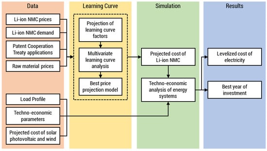 The general methodology is summarized in Figure 1. Historical data on the prices, cumulative demand, Patent Cooperation Treaty (PCT) applications, and raw material costs of Li-ion NMC are obtained. The future cost of Li-ion NMC is then forecasted from this data using different learning curve models. Cost projections from the best model are then taken as the Li-ion NMC capital cost in the HOMER Pro® microgrid optimization software. The software then calculates the optimum LCOE of energy systems in an off-grid island and a grid-tied commercial facility. The LCOE determines the best year for RE transition in both systems.