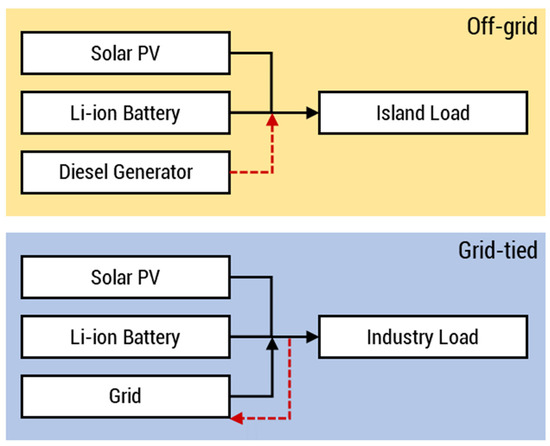 Two case studies are analyzed in this work: the off-grid Sabtang Island in Batanes, Philippines and a grid-tied commercial shopping mall in the Philippines. Each case study involves multiple scenarios outlined in Table 1. In the off-grid case study, solar PV and wind were considered due to the low cost [4] and high energy potential of these technologies [29]. Philippine laws encourage the use of RE for off-grid generation [30,31]. As for the grid-tied case study, solar PV generation was employed because it potentially minimizes the energy costs compared to solely drawing power from the grid [32]. The LCOE in each year for each scenario was calculated in HOMER Pro® using the projected battery prices from 2020 to 2025 as the capital cost of the Li-ion battery. The schematic diagrams of the case studies are presented in Figure 2. The pertinent techno-economic parameters for the simulations are detailed in Appendix B, while the generation and demand profiles are shown in Appendix C.