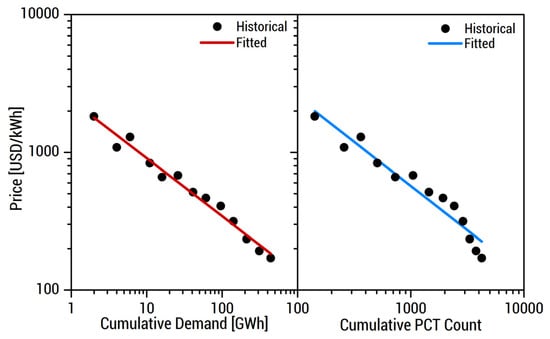 This work considers price reductions due to the increasing demand for energy storage (learning by using) and R&D (learning by innovation). Application of the conventional learning curve yields Equations (2) and (3) wherein is the battery price, is the cumulative demand for Li-ion NMC, and is the number of PCT applications.