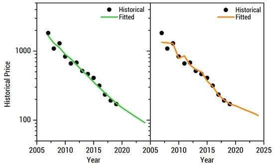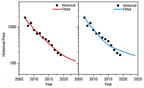 Econometric models such as the learning curves used in this work are very useful tools for short-term price projection due to their simplicity and wide data availability. Learning by doing and economies of scale are considered to be among the most applicable learning curve models in predicting future prices of new and emerging technologies [26]. Learning by doing performs slightly better than economies of scale because of the inherent learning effect from the exponential increase in cumulative production with respect to time [42]. Learning by innovation is represented by patent data due to its correlation with R&D investment and financial output. PCT count is a more appropriate indicator because it accounts for high quality R&D outputs [43]. Data availability is less of an issue for patents because of the wide range of market reports and patent databases. In contrast, using R&D expenditure as a metric does not directly provide insights on the technological and economic quality of R&D outputs. One of the main limitations of the single-factor learning curve is that it aggregates the price reduction effects of different independent factors [26]. Previous work indicates that providing more historical data and including additional factors, such as R&D and patent applications, improve the forecasting power of a conventional learning curve model [44]. However, collinearity emerges among the independent variables of a multi-factor learning curve model, mimicking the said limitation of the single-factor learning curve and resulting in imprecise coefficient values in the model [45]. This issue was addressed in the two-factor learning curve model by introducing a residual variable [46], decreasing the VIF, and removing the correlation between the two factors. The four-factor learning curve model performed the worst as it was too complex for the given historical data and resulted in overfitting. The model fails to generalize the available dataset and yields misleading predicted values [47,48].