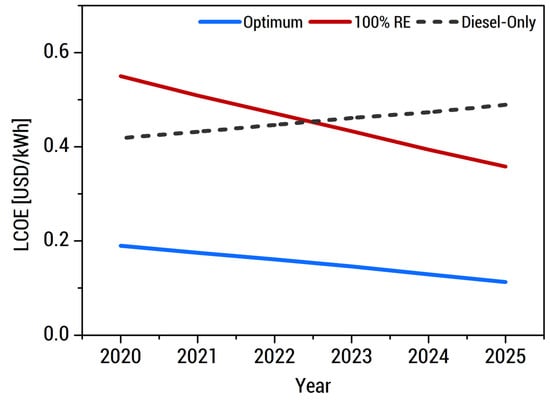 The results suggest that integrating the optimum system can be achieved in 2020, while investing in the 100% RE system can be achieved by 2023. Both scenarios also suggest investing in the succeeding years to lower the required investment. The results of both scenarios agree with previous work, stating that integrating solar PV, wind, and battery storage into the current diesel-powered energy system would reduce the investment, maintenance, and diesel consumption costs [39]. LCOE reduction in the following years is attributed to the decreasing prices of Li-ion NMC batteries and solar PV, which improve the economic competitiveness [38] and rapid adoption of RE resources.
