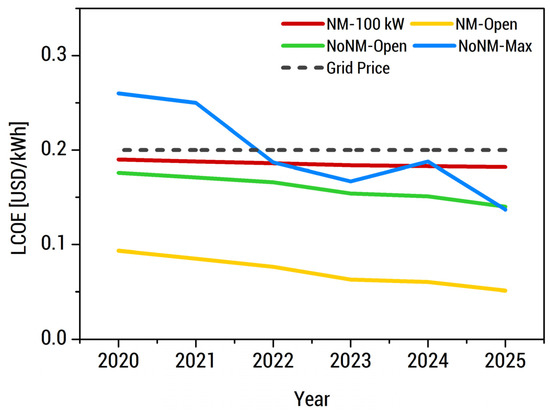 Calculated future LCOE of different grid-tied scenarios in comparison with the average annual cost of electricity from the grid within the analysis period of 2020 to 2025. The NoNM-Open scenario is the least-cost scenario allowed by current Philippine policies.