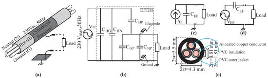 Schematic diagrams of electric field energy harvesting (EFEH) topology. (a) Single-electrode concept; (b) capacitive network, showing parasitic capacitors; (c) single-capacitor current model; (d) single-capacitor voltage model; (e) cross section of the electrical wire.