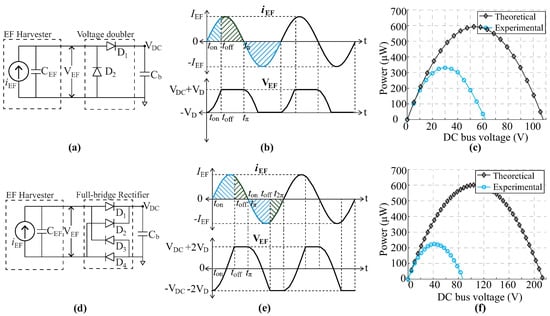 Main management circuits. (a) Voltage-doubler circuit; (b) current and voltage waveforms for a voltage-doubler circuit; (c) theoretical, simulated, and experimental output power considering a voltage doubler; (d) full bridge rectifier circuit; (e) current and voltage waveforms for a full bridge rectifier circuit; (f) theoretical, simulated, and experimental output power considering a full bridge rectifier.