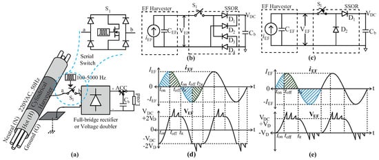 Even though there are already several preliminary works to insert the EFEH paradigm in urban and low-voltage systems, the current approaches basically consist of cylindrical harvesters mounted on three-core electrical wires, which are directly connected to classic converters (see Section 2.1). It is possible to ensure the energy transfer from the harvester to load by taking into account two premises: (i) the harvester’s current needs to be much higher than the leakage current, and (ii) parasitic capacitors of the diode package should be insignificant compared with . The conventional solution is either to increase the harvester length or harvester number. However, efforts should focus on using low loss embedded systems and power-saving polities to extend the sensor lifetime. This section introduces the management circuit called serial switch-only rectifier (SSOR). As Figure 4a illustrates, the circuit consists of a bidirectional switch serially connected to traditional management circuits (Figure 4b,d). When the bidirectional switch is turned off, is rapidly charged. During this time, works in an open-circuit mode. When is turned on, the circuit runs as a classic circuit. During this state, transfers the energy gathered in open circuit mode, which increases the transfer energy to load. The voltage and current waveforms associated with this circuit are shown in Figure 4c,e.