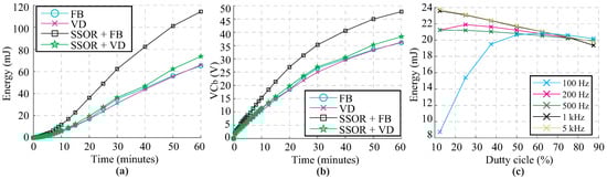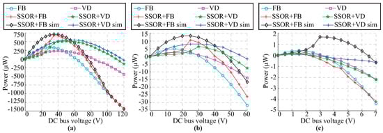 We replace with a DC voltage source to determine the harvester’s power according to the DC bus voltage. In addition, switching frequency is set at 5 kHz. It is worth noting that, for large harvester, SSOR topologies (i.e., SSOR connected to FB and SSOR connected to VD) outperforms traditional management circuits, by supplying more power, as shown Figure 6a. Although harvesting considerably more energy with reduced dimensions (i.e., smaller electrodes) is practically accessible (see Figure 6b), if the harvester length is significantly reduced full-bridge rectifier is the optimal option (see Figure 6c). The most common reason for this phenomenon is power losses in the bidirectional switch for SSOR topologies.