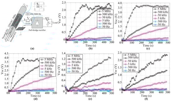 As seen in Figure 8b, when the frequency is altered from 50 Hz to 5 MHz while keeping the length constant, the gathered voltage significantly increases for the same time. The measurement results in Figure 8c,d show that harvester length should be increased to collect more charges. In addition, the available energy depends on the effective value of the voltage. In other words, more frequent data transmission can be enabled because the storage capacitor charging time is reduced. As Figure 8e,f suggest, it is worth noting that a cylindrical harvester (square voltage source) can store up to 11 mJ, while another one stores (sine voltage source) 5 mJ, in approximately 5 min, while keeping the frequency and length constant.