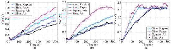 As shown in Figure 9, if an insulation layer (dielectric material) is installed between electrode and wire, the available energy increase because of the scavenging performance is directly associated with the permittivity of the material that forms the harvester. Empirical findings in Figure 9 show that polyimide film (Kapton, relative permittivity 3.34) outperforms paper (relative permittivity 1.4) by storing more charges, approximately 50 percent more, in the same charging period.