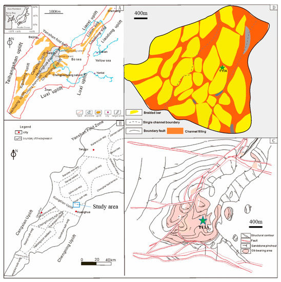 Samples were selected from the Guantao Formation in Yangsanmu oil field, Huanghua Depression, Bohai Bay Basin. The Huanghua Depression is located in the center of the Bohai Bay Basin, eastern China, and is one of the four major oil-bearing depressions in the basin [35,36]. It is a long and narrow depression running southwest to northeast (Figure 1A). Yangsanmu Field lies between the Kongdian Uplift and Qinan Sag in the depression (Figure 1B) and has produced petroleum for about 50 years. The field is geologically located at a faulted-anticline whose long axis points runs southwest–northeast. The anticline is separated by a northeastern normal fault which is sealing (Figure 1B). In the past 40 years, there have been four wells drilled in the area and the latest, well Y11A, was drilled in October 2018 and is at the center of the anticline (Figure 1C). The well Y11A penetrated a braided bar sandstone reservoir, the size of which is approximately 0.5 × 1 km in area (Figure 1D) [37].