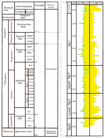Above basement rocks, there are Paleogene, Neogene, and Quaternary sediments in the Huanghua Depression (see Figure 2). The Paleogene is subdivided into three formations including Kongdian (Ek), Shahejie (Es), and Dongying (Ed) while the Neogene includes the Guantao (Ng) and Minghuazhen (Nm) Formations. There is a regional unconformity between Dongying (Ed) and the Guantao Formation [37]. There are three members in Ng and the target reservoir for this study is the second member (Ng2) (Figure 2). During the Ng2 stage, the climate of the Bohai Bay Basin was mid-subtropical warm and humid and the basin was structurally at a stage of slow subsidence [37,38].
