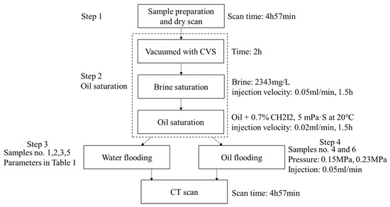 - Step 3: water flooding experiments. Experiment nos.1, 2, 3 and 5, were carried out according to the experimental plan in Table 1. After the experiments, each sample was scanned by X ray CT for 4 h and 57 min.