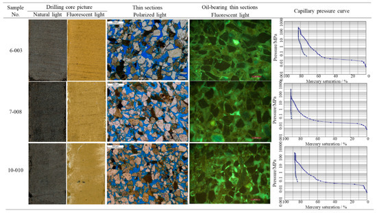 As mentioned above, the six samples used in the displacement experiment were collected from three depths. It means that there were two parallel samples whose features were more or less the same at each depth. Mineral components of the three groups of samples are listed in Table 4. The samples of the three groups had very similar contents of quartz, potash feldspar, plagioclase, calcite, dolomite, and total clay minerals. The microscopic oil-bearing condition and plane porosity of the three sample groups were similar (Figure 4).
