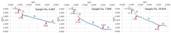 The relationship of displacement pressure (Pc) and water saturation (Sw) has segmented characteristics and presents as four straight lines with the different gradients in the lgPc-lgSw scatter diagram (Figure 5). According to Formula (7), fractal geometry parameters are derived from Figure 5. The three samples have similar fractal parameters (Table 6). From the fractal geometry parameters listed in Table 6, four characteristics can be indicated: