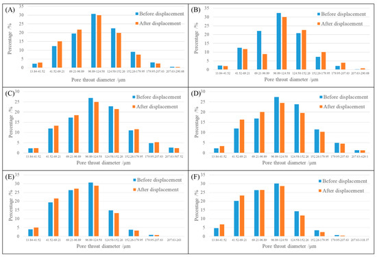 Overall, chemical flooding decreased porosity and increased the heterogeneity of pore structures. In Figure 10A, the distribution of retained polymer in the space can be visualized in the digital core model. Some narrow “neck” connecting adjacent pores is blocked such as (a) in Figure 10C. Large pores can be partially filled and divided into small pores just like (b) in Figure 10B,C. Small pores around the large pore are wholly or partially filled as (c–e) in Figure 10B,C. It can be concluded that the mechanism of chemical flooding’s influence on pore structures is the blocking and filling of the residual polymer. Considering the above mechanism, choosing polymers that have suitable molecular size and structure is very important in EOR.