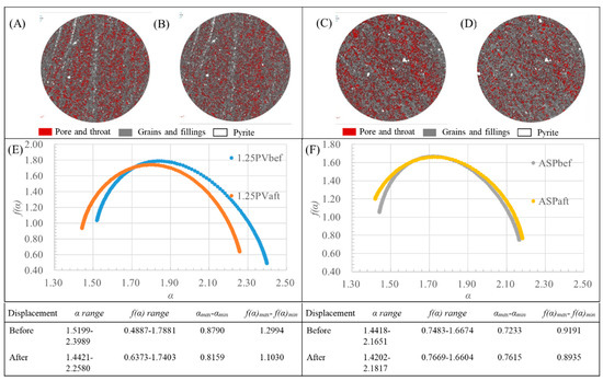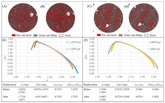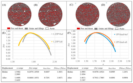 Multifractal parameters change after the displacement experiments. For Experiment no.2 with 1.25 PV water injection, although the geometry of curves and the maximum f(α) before and after the experiments are similar, the Δα decreases slightly after water flooding (Figure 7E). In Figure 7F, it can be observed the two curves coincide when α is in the range 1.80–2.30, and the curve before displacement is enclosed by that after displacement. It is obvious that Δα increases after the experiment. The geometry of curves in the Figure 7F, Figure 8E,F and Figure 9F are similar such that the f(α)-α curves of samples after displacement are gentler and wider.