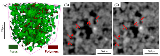 Pore structure changes after the ASP displacement experiment. (A) The result of Experiment no.6. Pore distribution model after ASP flooding. The area in green is pores and that in brownish-red is polymesr retained in pores. Pictures in (B,C) are the same CT image before and after ASP flooding.
