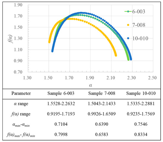 Firstly, multifractal analysis of the 2D thin section image was made to describe the geometrical heterogeneity of pores before flooding. The f(α)-α crossplots and multifractal parameters in Figure 11 indicate the difference in pore structure heterogeneity of the reservoir sands. In f(α)-α crossplot, the geometry of f(α)-α curves of the samples 10-010 and 6-003 are similar while that of sample 7-008 is obviously different (Figure 11). Quantitatively, the width and height of the curves are different. The width of α (range of αmax−αmin) and maximum f(α) of the samples all decrease in the order of samples 10-010, 6-003, and 7-008 (Figure 11).