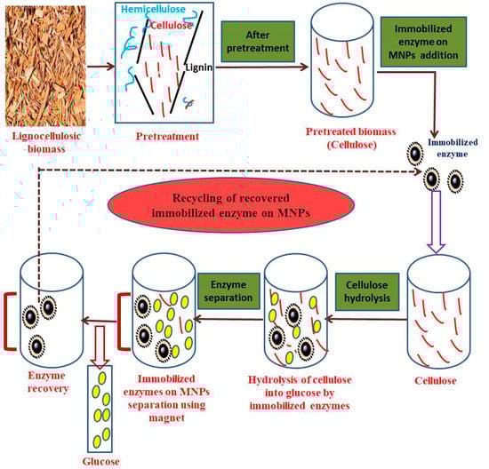 NP-mediated enzyme catalysis (by immobilizing cellulases/hemicellulases on MNPs) could effectively produce simple sugars and biofuels from LB conversion, and immobilized enzymes could be magnetically recovered and reused []. Recently, enzymes immobilized on MNPs are under potential consideration as they provide numerous benefits such as biocompatibility, higher stability, larger surface area, and improved mass transfer []. Compared to free enzymes, enzymes immobilized on carriers such as MNPs exhibited higher thermal and pH stability []. Immobilized β-glucosidases on MNPs were used as a nanobiocatalyst for cellobiose hydrolysis, achieving a binding efficacy of 93%. They were reused for about 15 cycles, possessing about 50% of hydrolytic activity until the last cycle [].