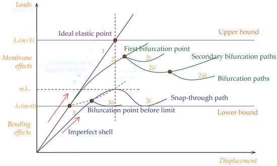The buckling behaviour of cylindrical shells distinguishes between bifurcation and the limit buckling point, as the local compression increases. Figure 1 shows that the bifurcation tends to occur in the ideal elasticity state (curves 1 and 2) involving both linear and nonlinear prebuckling paths. In this figure, the vertical axis represents axial compression while is the ideal critical load factor of the structure. The horizontal axis represents the displacement, namely the end shortening of the shell structure. Bifurcation buckling paths could be symmetric or asymmetric and stable or unstable, which reflects in the secondary bifurcation buckling paths past the first bifurcation point, e.g., curves 2i, 2ii, and 2iii (and there are probably more subsequent bifurcation paths). Another key aspect of buckling is the limit point buckling or ultimate point along the smooth load–displacement curve, with or without snap-through behaviour. Shells with imperfections due to factory construction or on-site installation are prone to experiencing snap-through behaviour. That is a dynamic jump takes places after the limit point, which triggers a new equilibrium (perhaps more stable) path. The bifurcation path may emerge along the limit point buckling path such that the relation between the load and deformation curve fulfils a bifurcation point solution before reaching the limit point at load factor , as depicted along the curve 3–3ii. This is a problem of buckling equilibrium paths, based on buckling control equations, when considering large initial geometrical imperfections.