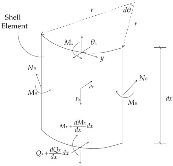In Figure 3, the circumferential load and moment do not vary with coordinate θ, because the circumferential displacement equals zero in this adopted linear model. Furthermore, by letting , and be the displacements in the x, y, and z direction, respectively, one derives the following basic equilibrium equations [21,32,37]: