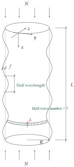 The longitudinal and circumferential buckling under pure axial compressive load, expressed by trigonometric functions, can be assumed as in Figure 5.