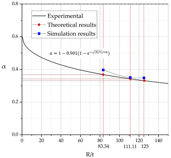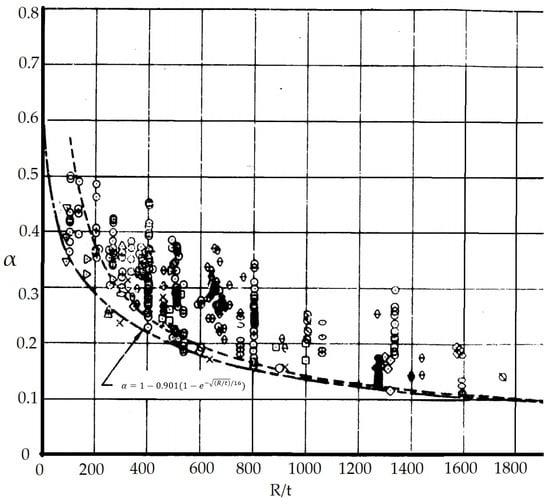 where represents the critical compressive stress component of the perfect shell in the one direction. The experimental data concluded by NASA [55,56] is shown for a better reference in Figure 9.