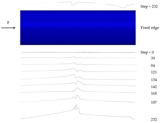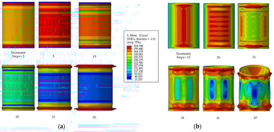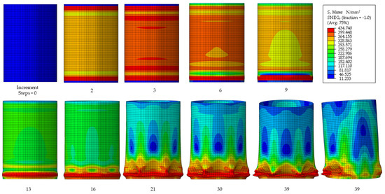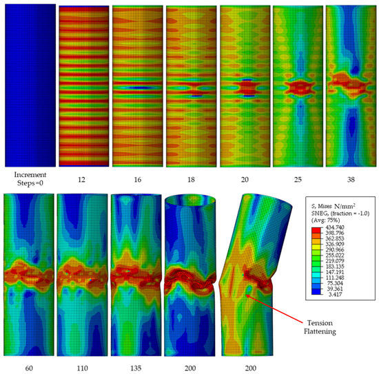 The amount of the axial compressive load applied on the upper reference point during the Riks algorithm fed from the previous linear buckle analysis for each model, and the amount of bending moment was assigned at relatively large scales to exceed the plastic range of material stress as predicted by Equations (44) and (46). The Riks increments implemented in ABAQUS would thus approach the failure state until the fixed 1000 steps are completed otherwise the job is aborted to prevent a lack of convergence.
