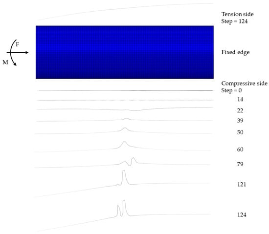 Along the longitudinal direction of tubular shells, pure bending wrinkles shell regions subject to the highest compression stress, as shown in Figure 6. The pure bending moment thus triggers prebuckling on the compressed wall while stretching the tension side, as in Figure 6a. The interaction between bending and axial stress is complex and has deserved ample study in the past [37,41,42,43,44,45,46]. The present investigation thus intended to shed light on the nature of the collapse mechanism derived from lateral loading affecting wind turbine towers, through the mathematical formulation exposed in the following paragraphs.