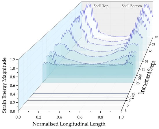 where, represents the total potential energy stored by the shell elements, and the represents energy input from external load or environmental factors. Various possible energy paths have been applied in the above equations, and when δ∏ = 0, the neutral equilibrium state of the transition realises. When this principle translates to the eigenvalue problem involving the stiffness, geometries, and displacement matrices, in both its linear and nonlinear part, a typical simplified quadratic eigenvalue problem of the form unveils [32,33],