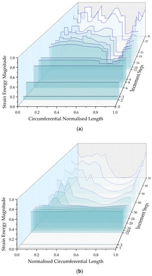Equation (30) is distinguished from Equation (21). The former provides the integration in polar coordinates and is split from stretching strain energies. Moreover, by substituting Equation (27) into Equation (30), combined with displacement functions (28) enables quantifying the basic total strain energy of the unstretched shell section (the first element obliterated) as follows [21]: