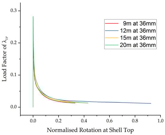 In Equations (3) and (4), represents the matrix of initial elastic stiffness, represents the matrix of initial linear geometries, represents the respective matrix of linear displacements, represents the initial geometrical stiffness matrix in quadratic form, represents the initial displacement matrix in the quadratic form, and is the nodal displacements of the selected element in the form of a vector. Equation (4) approximates the classical eigenvalue problem by ignoring the shell initial displacement. Incremental methods could solve the numerical problem through incremental load steps, whose equilibrium is checked iteratively. The solution of Equation (3) also relates to the critical load factor depicted in Figure 1; is the eigenvalue solution of Equations (3) and (4), and is equal to when it gets to its minimum value; this factor could in turn establish a relationship with a membrane and bending components (, respectively), as follows: