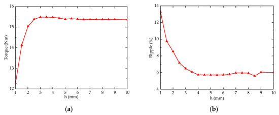 The results of parameterization: (a) relationship between average torque and h; (b) relationship between torque ripple and h.