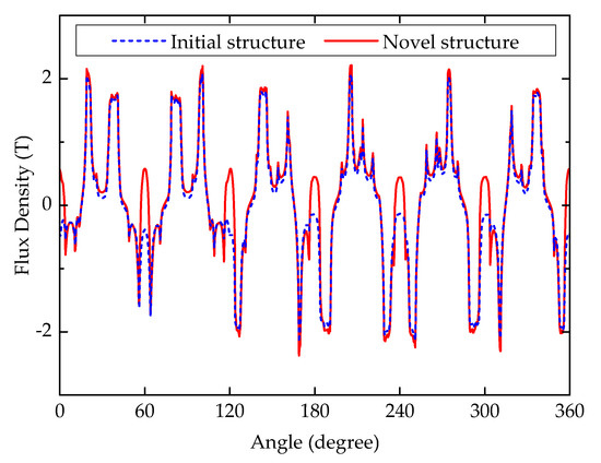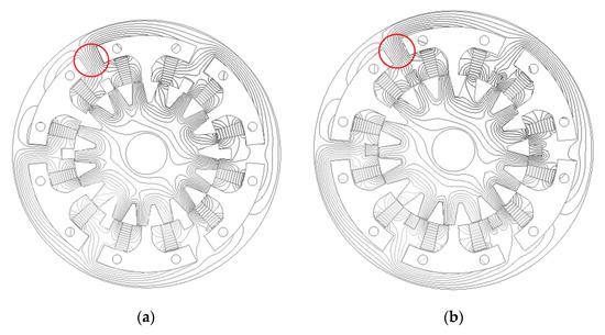 Meanwhile, it can be distinguished from Figure 4 that the no-load magnetic field distributions of the novel structure are different from the initial structure. Additionally, in the structure of the proposed machine, the magnetic flux density of its stator is somewhat greater than that of the conventional structure. In Figure 4, from the circled part, nine magnetic lines on Figure 4a and 10 lines on Figure 4b can be seen. It can be observed that the flux density in Figure 4b is higher. As shown in Figure 4a, there is no flux distribution in the dummy slot, but, magnetic lines of magnetization direction are added in the dummy slot for Figure 4b. This is because permanent magnets are increased in the dummy slots of the proposed structure. It can be observed from Figure 4 that the distortion of the magnetic lines of force is also reduced with the increased permanent magnet. The higher the magnetic density at the stator, the greater the torque that can be produced under the same current.