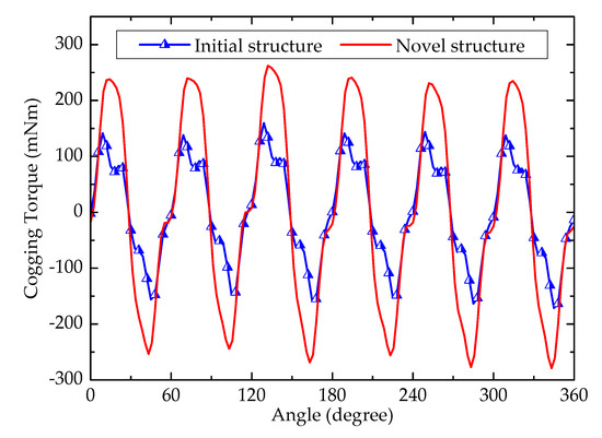 At the same time, peak-to-peak value of cogging torque of the proposed machine (0.54 Nm) is higher than that of the initial machine (0.33 Nm), as shown in Figure 6. Additionally, the energy in the air gap is related to cogging torque, so the formula for calculating the cogging torque [9] can be written as:
