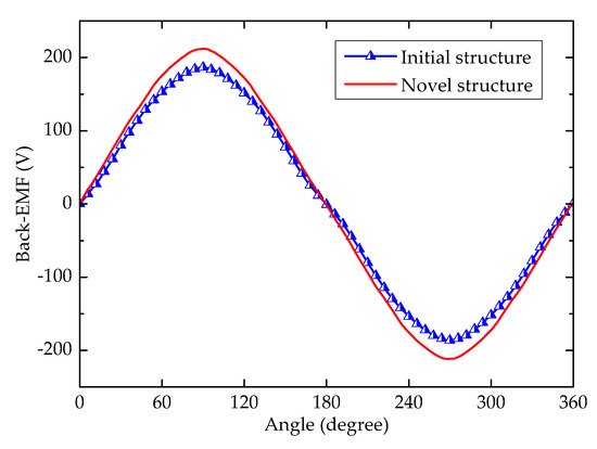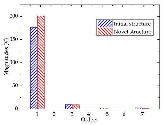 After adding magnets in the dummy slots of the stator teeth, the amplitude of fundamental back-EMFs is enhanced. It can be observed from Figure 8 that the third, fifth, and seventh components harmonics of on-load back-EMF are reduced greatly after adding magnets. Then, with magnets located in the dummy slots, the fundamental harmonic of on-load back-EMF is enhanced from 176.1 to 200.6 V. The total harmonic distribution (THD) of initial and proposed E-shaped stator tooth machines is 5.7% and 4.7%, respectively, and there is no additional extra harmonic introduced into the targeted on-load back-EMF.