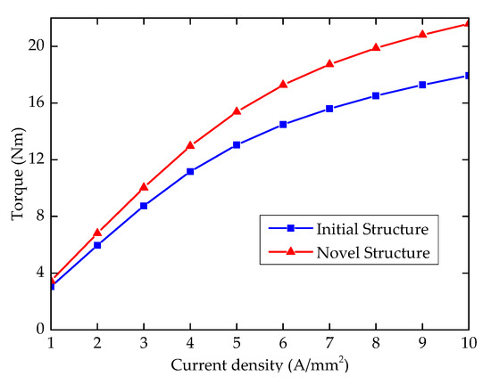 Average torque waveforms versus the current density.