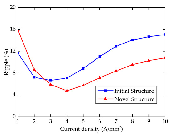 Figure 9 and Figure 10 indicate that the two machines are controlled by id = 0 mode, where the current density ranges from 1 to 10 A/mm2, while the stator coil turns and the slot packing factor is 73 and 0.45, respectively [8]. Results imply that under 10 A/mm2, the average torque of the proposed structure is significantly greater than that of the initial structure. As far as torque ripple is concerned, the proposed machine is also somewhat smaller than the E-shaped stator tooth structure above 2 A/mm2, after adding the magnets in the dummy slots of stator teeth. The average torque of the proposed machine (15.38 Nm) is greater than that of the conventional one (13.04 Nm) at the rated current density (5 A/mm2).