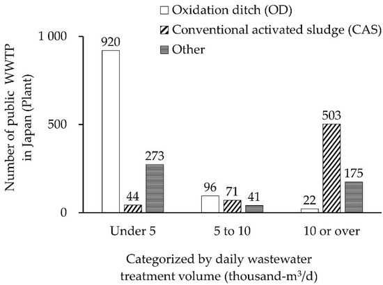 Number of wastewater treatment plants (WWTPs) in Japan categorized by daily treatment volume (m3/d) [7].