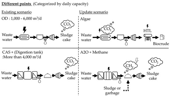 Existing and updated scenario classified by WWTP treatment process with daily treatment capacity.