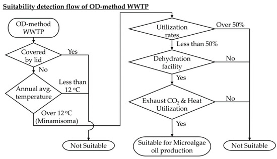 In Japan, a decline in the treatment population between 2010 and 2040 will affect 92% (110/119 plants) of WWTPs [9]. The treatment capacity ratio of the facilities based on the daily average treatment volume tends to increase. Therefore, it is expected that the number of OD process WWTPs with microalgae oil production will increase in the future.