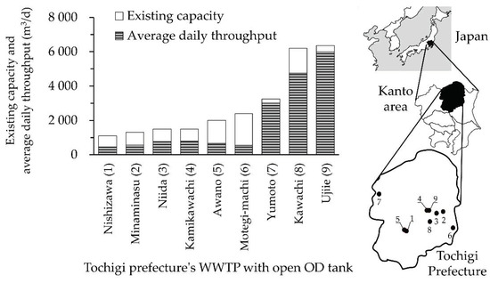 Facility utilization and locations of nine open-air (no cover) OD process WWTP in Tochigi Prefecture, Japan [14] (Map: Japanese GSI website).