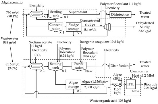 2.2.2. Introduction of Microalgae Oil Production Process at Awano WWTP (Algal Scenario)
