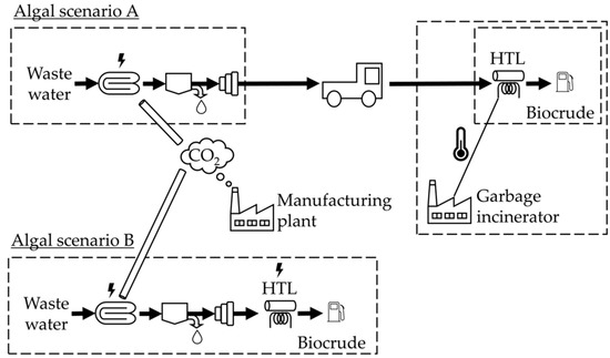 Algal scenarios A and B were established to compare the differences in cost associated with the proximity of neighboring facilities (Figure 7). In algal scenario A, a 20% suspension of dehydrated algae is transported for HTL at a garbage incinerator. The HTL is performed using waste heat from garbage incineration. In algal scenario B, the HTL is undertaken in a WWTP using an electric heater. As expected, scenario A had better performance in terms of cost and environmental impact. However, in some cases, there were challenges in the transport of the algae or the use of garbage incinerators.