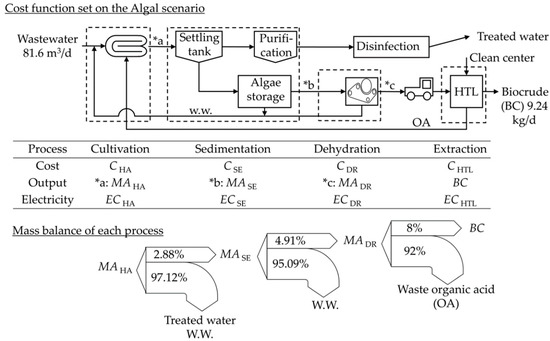 The cost function and mass balance for each process, based on the flow of the algal scenario (Figure 6).