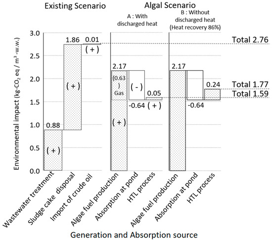 If the heat of the HTL is generated from electrical energy without using discharged heat, the environmental impact (without heat recovery) amounts to an additional 1.34 kg-CO2 eq/m3-w.w. for the HTL process in algal scenario A. The total environmental impact was 2.95 kg-CO2 eq/m3-w. kg, which was higher than the existing scenario (2.76 kg-CO2 eq/m3-w.w). In addition, we estimated the environmental impact of the algal scenario assuming 86% heat recovery in algal scenario B (Equation (13)). As a result, the total environmental impact was found to be 1.77 kg-CO2 eq/m3-w.w., which was approximately two-thirds of the existing scenario (Figure 9).