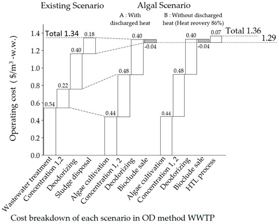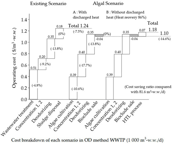 The operating cost per m3 of incoming wastewater, assuming 81.6 m3 per day, was calculated from the above-developed cost functions and the cost function of the operating cost of the sewage treatment plant under the existing OD method [20] (Figure 10, Table A1). The operating cost of the algal scenario reflects the 81.6 m3 part of the algal scenario (Figure 6). In addition, the existing scenario reflects the 81.6/848 m3 portion (9.6%) of the existing scenario (Figure 5).