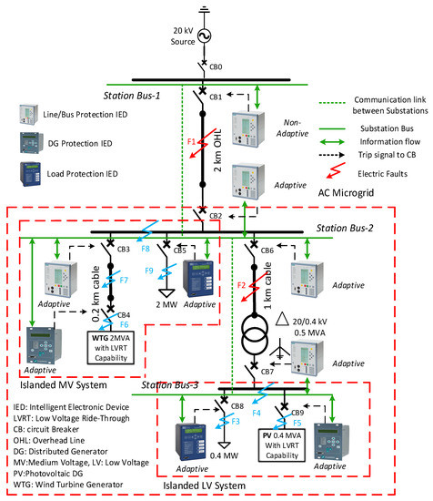 The schematic diagram of a radial AC microgrid under study is shown in Figure 2. The considered AC microgrid consists of one MV bus of 20 kV (Substation Bus-2) and one LV bus of 0.4 kV (Substation Bus-3). A load of 2 MW at Substation Bus-2 is supplied by a wind turbine generator (WTG) of 2-MVA capacity, whereas a load of 0.4 MW at Substation Bus-3 is supplied by a photovoltaic (PV) generator of 0.4 MVA. The MV bus (Substation Bus-2) of the AC microgrid is connected with the LV bus (Substation Bus-3) of the AC microgrid through a 1-km-long, 20-kV cable line and 0.5-MVA, 20/0.4-kV transformer. The AC microgrid is connected with the main grid through a 2-km-long, 20-kV overhead line and an intermediate 20-kV Substation Bus-1. The WTG is connected to Substation Bus-2 through a 0.2-km-long 20-kV cable and a 2-MVA, 0.69/20-kV transformer (inside the WTG model). A 2-km overhead line between Substation Bus-1 and Substation Bus-2 is protected by two circuit breakers, CB1 and CB2, with the related protection IEDs. The protection IED1 is considered to be a nonadaptive IED due to its direct connection with the main grid, whereas the protection IED2 is considered as an adaptive IED. In the grid-connected mode, IED2 operates with settings that enable the tripping of CB2 in the case of bus fault F8 at Substation Bus-2 and facilitates the transfer trips of CB2 after receiving the CB1 open-state signal in the case of short-circuit fault F1. However, if IED2 fails to receive a CB1 open-state signal in the case of short-circuit fault F1 after the opening of CB1 and the AC microgrid already changed to islanded mode with a trip-block signal to all IEDs, this will be the failure of the transfer trip. In this case IED2 can provide a backup operation by opening CB2 with the fault current still coming from the DGs within the AC microgrid. This can be performed by IED2 either with the islanded mode settings or using the current magnitude comparison and the direct transfer trip failure logic, as explained later in Section 4. The IED2 may take quite some time to change its active group settings from the grid-connected mode settings to the islanded mode settings, and this will require DGs to remain online for additional time beyond the standard LVRT curve until the IED2 settings are changed and the tripping of CB2 is executed. However, the backup operation of CB2 by the direct transfer trip failure logic implemented at IED2 could be performed within the standard LVRT curve. In the islanded mode, the IED2 settings are adapted so that the fault F1 is detected when the CB1 is open. The 1-km cable line between Substation Bus-2 and Substation Bus-3 is protected by CB6 and CB7 with the related protection IEDs. The protection IED6 and IED7 are also considered to be adaptive.
