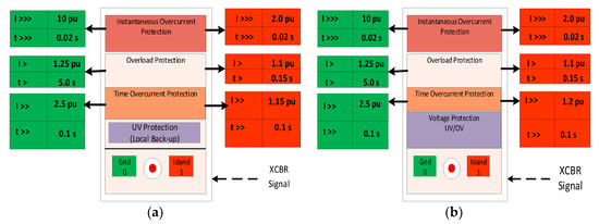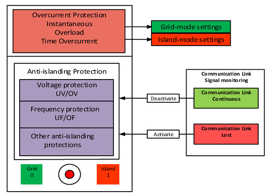 The adaptive IEDs with two preplanned setting groups for AC microgrid lines are provided with only under-voltage (UV) local backup protection (Figure 3a) and adaptive IEDs with two preplanned setting groups for loads with both under and over-voltage (UV/OV) backup protection (Figure 3b). The DG protection IEDs (IED4 and IED9) are also considered to be adaptive in order to differentiate between the grid-connected and islanded mode operations. Moreover, DG protection IEDs should not trip instantaneously in the case of all external faults and allow DGs to provide fault current contributions according to predefined standard LVRT characteristics. A multifunctional adaptive IED for the protection of converter-based DGs is shown in Figure 4, which consists of adaptive OC and anti-islanding protection functions. In practice, DGs may be provided with unit protection and IEDs with several fault protection and anti-islanding protection functions. In this study, the anti-islanding protection functions (passive/active methods) of DG protection IEDs are assumed normally “disabled” if the communication link is continuous and enabled quickly when the communication link is lost. Thus, communication-based loss-of-mains detection with no nondetection zone can be used as a primary means of anti-islanding protection and passive/active methods as backup in the case of communication link failure. All the sensitive protections within the islanded AC microgrid need to be disabled/interlocked during the starting of DGs, motor loads and during the transient period when changing from the grid-connected to islanded mode and vice versa.