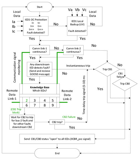 Flowchart for communication-based nonadaptive IED1 providing primary protection for fault F1 and remote backup for all downstream faults in the grid-connected mode. UV: Undervoltage protection.