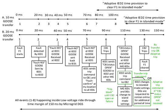 Although several faults may happen in the presented AC microgrid, only adaptive protection methods and results of three-phase ungrounded short circuit faults with 0.01-Ohm fault resistance at locations F1 and F2 are presented. Moreover, for the sake of simplicity, it is assumed that three-phase fault F2 occurs only in the islanded mode. Nevertheless, the adaptive protection method for fault F2 also considers the protection option in the case of F2 in the grid-connected mode, as explained in the following text. Figure 5 shows the flowchart of communication-based nonadaptive IED1 for protection during fault F1. IED1 provides primary protection for fault F1 and the backup protection with definite time delay for all other downstream faults using OC relay and UV protection works as backup of the OC relay. The IED1 normally uses the redundant communication link to get information about downstream faults and use this information for trip decisions. If the fault is downstream, it waits for the CB2 to trip first. On receiving a CB2 failure signal, it trips CB1 and sends a CB1 status “open” GOOSE message (XCBR signal) to all IEDs to change their settings to the islanded mode. Even if CB1 fails, it can transfer the trip incoming breaker CB0 of substation-1 to initiate the islanding. If no communication link is available, IED1 will simply trip CB1 using definite time delays depending on the magnitude of the current. Figure 6 shows the steps for the clearance of fault F1 using GOOSE messages with different transmission delays. In both cases, at step 7, IED2 can be used in an adaptive manner for tripping CB2 to clear F1 completely, if not directly tripped by the CB1 status transfer trip, as mentioned in step 7 of Figure 6. If CB2 is not tripped with the CB1 status transfer trip or the adaptive trip by IED2, then fault F1 will not clear due to fault energization by DGs in the AC microgrid, and DGs will trip after LVRT time is elapsed.